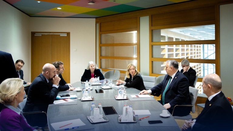 Maďarský premiér Viktor Orbán, italská premiérka Giorgia Meloniová, francouzský prezident Emmanuel Macron, německý kancléř Olaf Scholz a šéfka Evropské komise Ursula von der Leyenová na ranním jednání před summitem EU. Zdroj: X/Orbán Viktor
