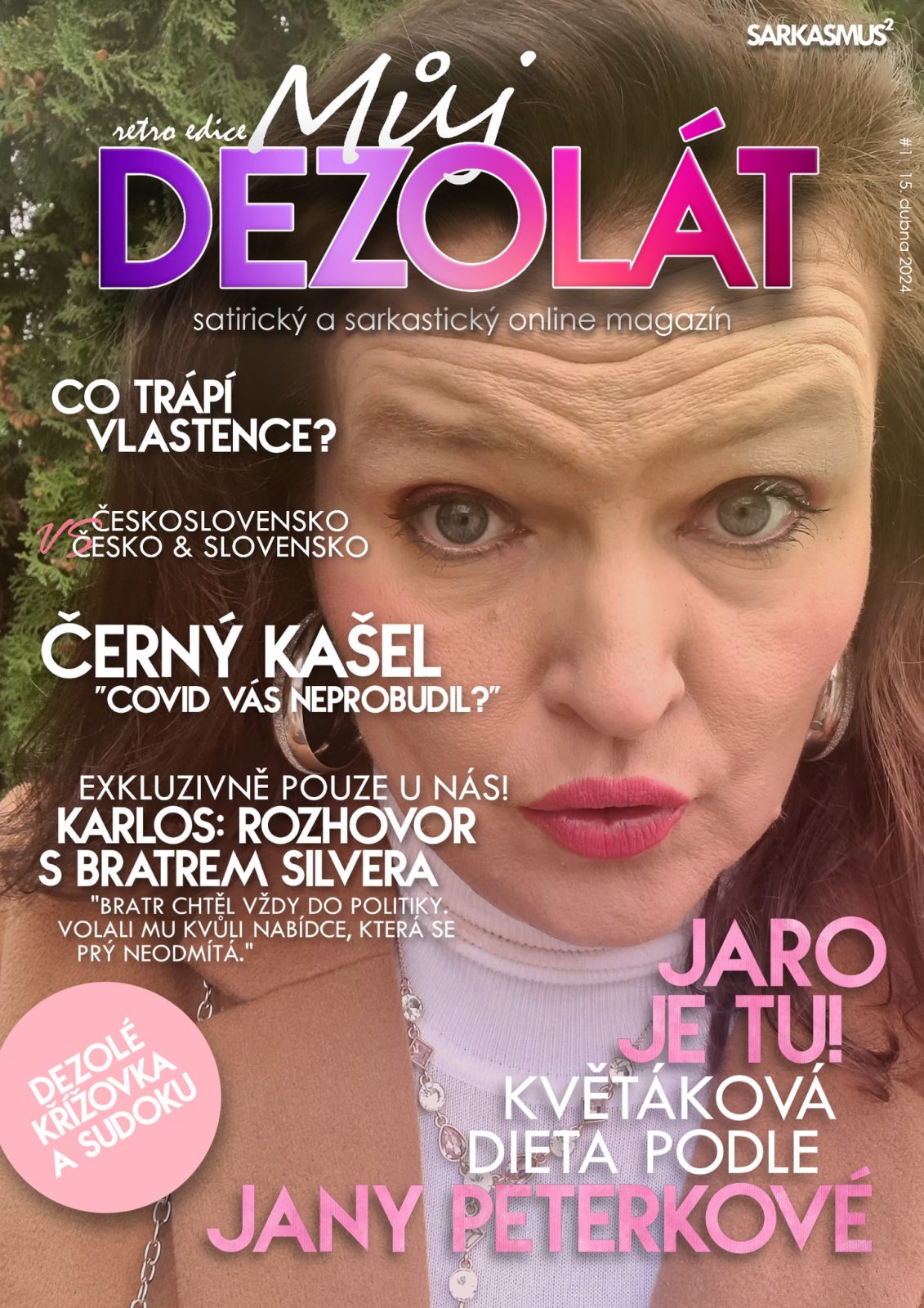 Ale jde ještě vůbec o humor jako takový? Sotva. „Jdi mezi lidi, říkali. To tě nezabije, říkali,“ dočteme se u velké fotografie zasmušilého Roberta Fica v květnovém čísle Dezoláta, vydaném pouhé dva dny po Cintulově atentátu. Zatímco za komentáře ke střelbě na filozofické fakultě navštěvovala občany kriminálka ještě o Vánocích, ohledně Fica je takové vtipkování v pořádku. První číslo magazínu Můj DEZOLÁT vyšlo už 15. dubna 2024, ale vypadalo odlišně. Více než titulní stranu s Janou Peterkovou se mi z něj zachránit nepodařilo, původní odkaz byl již nefunkční. Vypadalo podobně, jako by jen někdo přepsal nadpisy a texty v šabloně nějakého kosmopolitního lifestylového magazínu. Najdeme zde třeba necenzurovaný deníček Aleny Schillerové od Jindřicha Vobtáhla, velký dezolátský test, zda nejste náhodou proruští či antisystémoví, úspory Mikuláše Beka odpoledním doučováním češtiny pro dezoláty a závěrečnou Dezolé osmisměrku, jejíž tajenkou je lapidární sdělení „ANDREJJEVŮL“.