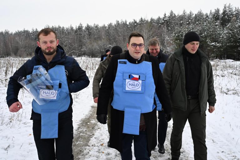 Český ministr zahraničních věcí Jan Lipavský (uprostřed) si při návštěvě Ukrajiny prohlédl projekt odminování v Myle u Kyjeva, který vede organizace HALO Trust a finančně se na něm podílí Česko. Zdroj: Profimedia