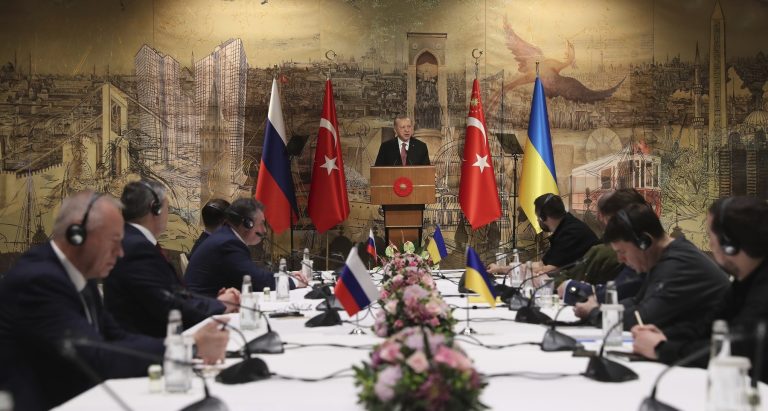 Turecký prezident Recep Tayyip Erdogan při jednání o míru mezi ruskou a ukrajinskou delegací v Instanbulu v 29. března 2022. Zdroj: Profimedia