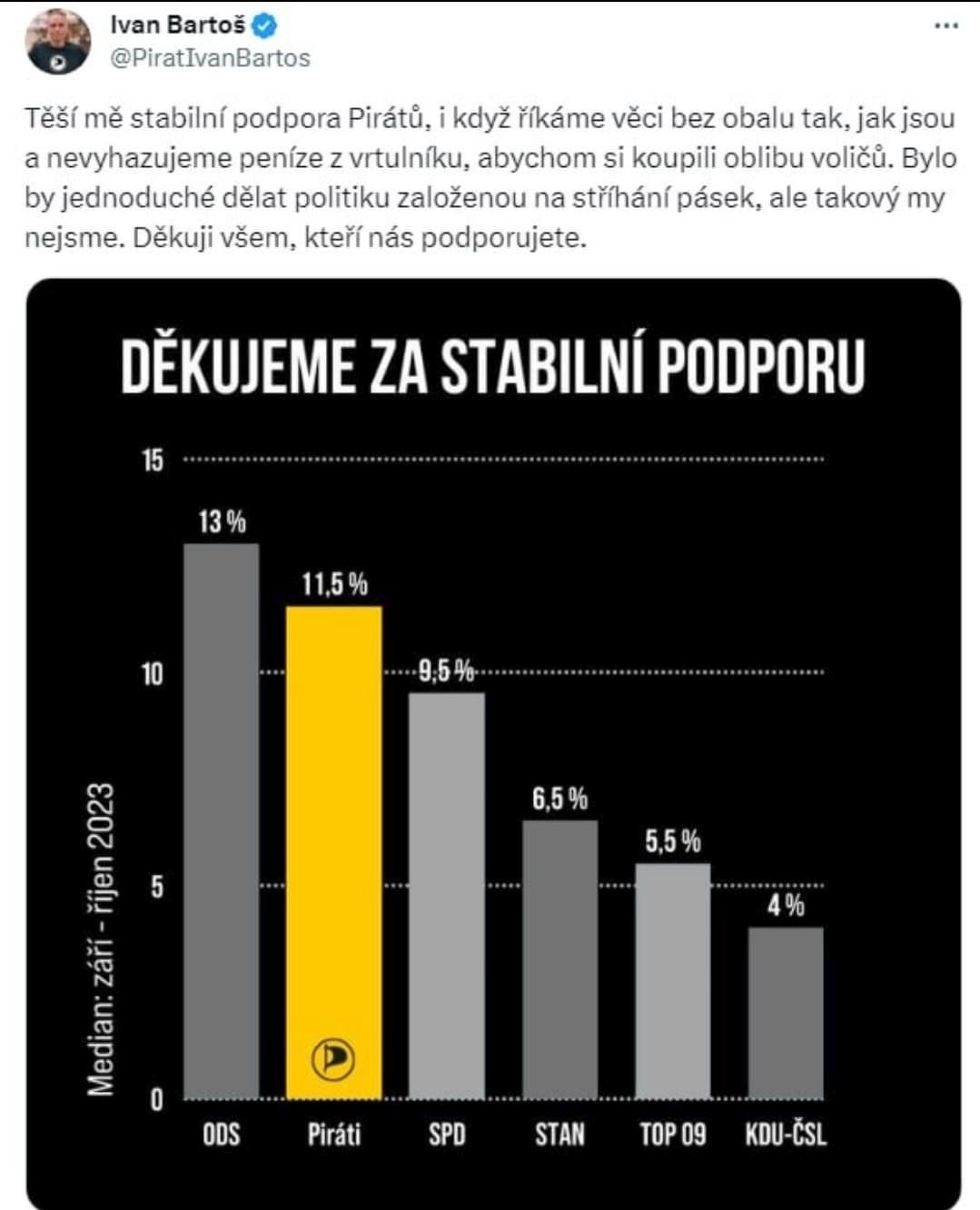 Prostřednictvím barevného sloupcového grafu chce u veřejnosti vyvolat dojem, že Piráti jsou nejsilnější stranou po Fialově občanských demokratech. Následuje SPD a STAN, TOP 09 a KDU-ČSL. Ivan Bartoš ovšem z grafu podpory veřejného mínění odstřihl nejsilnější českou politickou formaci, kterou je Babišovo hnutí ANO s 34 procenty voličské podpory, což je více než třikrát více, než mají Piráti.