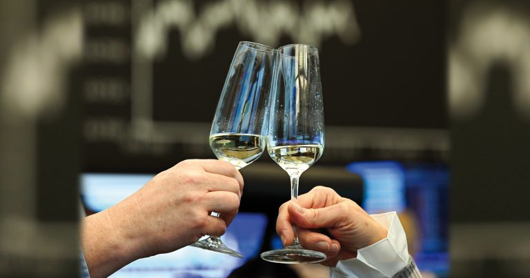 29 December 2023, Hesse, Frankfurt/Main: Two traders toast with champagne in the trading hall of the Frankfurt Stock Exchange in front of the display board showing the Dax curve. On the last trading day of a strong stock market year 2023, the German benchmark index (Dax) is little changed.,Image: 833042522, License: Rights-managed, Restrictions: , Model Release: no, Credit line: ČTK / DPA / Arne Dedert