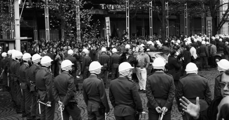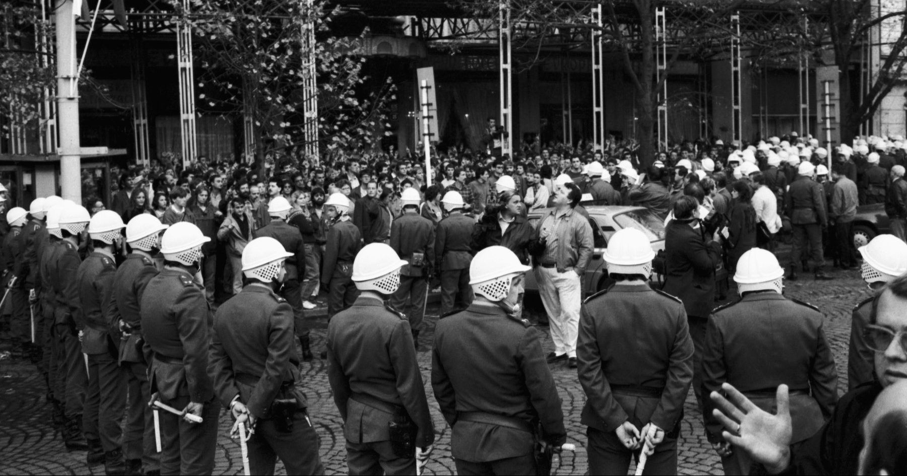 Tu od orloje zazní nikoli vyzvánění kostlivce, leč nesmělé skandování hloučku čítajícího sotva dvě desítky hlav. O tom, co chceme, i o těch, které nechceme. Reakce veškerá žádná, byť opodál blokují ústí Železné a Celetné další strážci pořádku a klidné cesty ke komunismu, kterou si nedáme narušovat. Naproti na začátku Pařížské zase číhá žlutobílá lada s ampliónem na střeše, záda jí kryjí dva plné autobusy s kladenskou poznávací značkou. Na boku nápis SONP, uvnitř šedomodré uniformy proti lidu nasazených Lidových milicí.